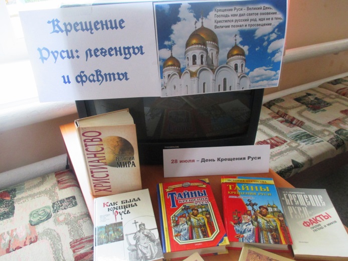 Дню Крещения Руси был посвящён цикл книжных выставок, экспонируемых в библиотеках БУК «Тюкалинская ЦБС» на прошедшей неделе: «Крещение Руси: легенды и факты» (ЦРБ), «Как крестили Русь» (городская библиотека), «Русь православная – звон колоколов» (Октябрьская библиотека), «Святая матушка – РУСЬ!» (Солдатская библиотека) и другие. Праздник установлен в честь одной из главных вех в истории Руси — провозглашения в 988 году христианства в качестве государственной религии. Представленная литература рассказала о том далёком событии: его истории, причинах, предпосылках.