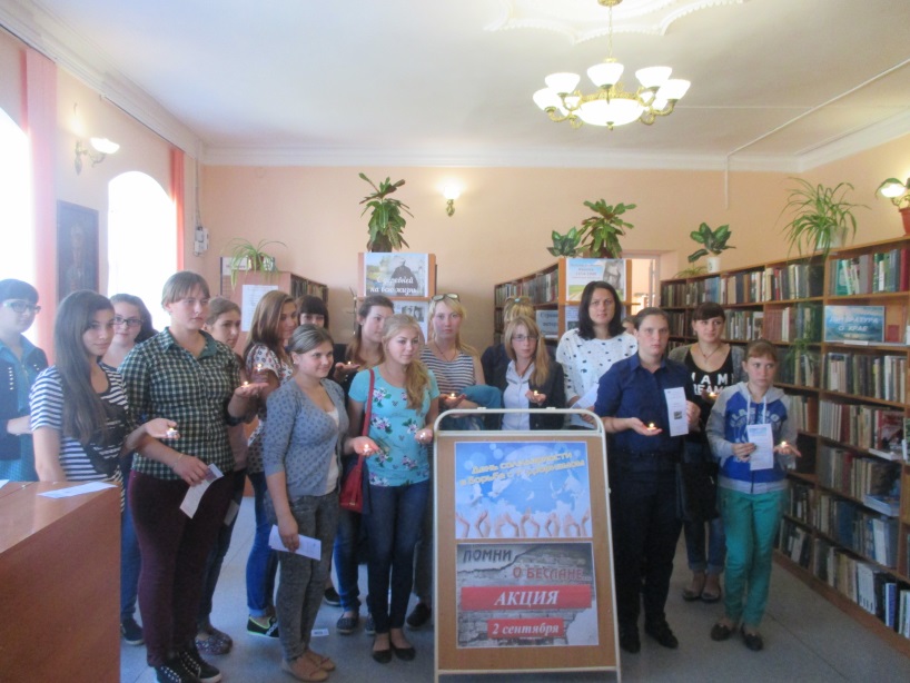 В центральной районной библиотеке для студентов профессионального колледжа состоялся час памяти «Зажгите свечи», посвящённый трагедии Беслана. Учащиеся узнали о происхождении терроризма, самых крупных террористических актах, зажгли свечи в память о его жертвах.