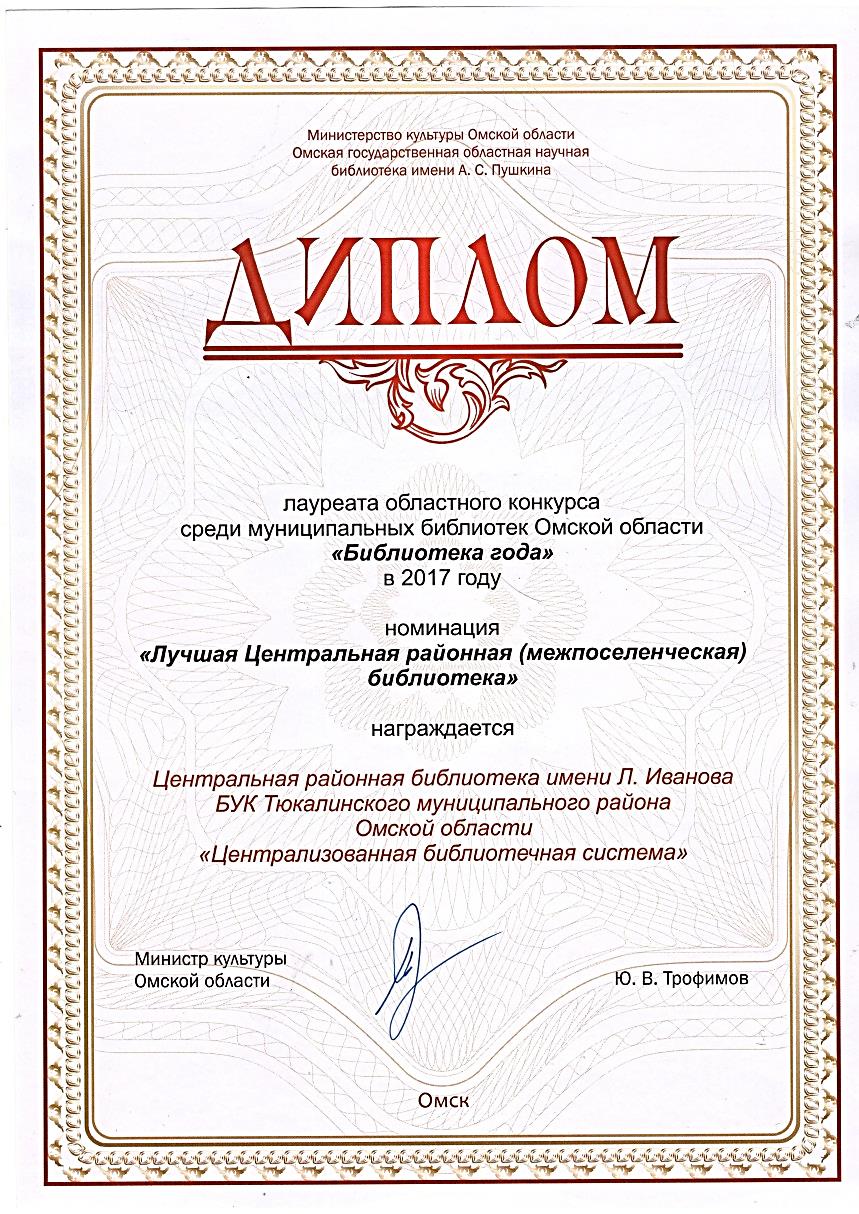 На ежегодном совещании руководителей государственных и муниципальных библиотек Омской области состоялось подведение итогов областного конкурса среди муниципальных библиотек Омской области «Библиотека года» в 2017 году. Победителем в номинации «Лучшая центральная районная (межпоселенческая) библиотека» стала Центральная районная библиотека имени Л. Иванова Бюджетного учреждения культуры Тюкалинского муниципального района Омской области. Поощрительным Дипломом участника областного конкурса в дополнительной номинации «Сельская библиотека: новые ориентиры и возможности» отмечена Атрачинская сельская библиотека. Центральная детская библиотека получила Сертификат участника в номинации «Лучшая детская библиотека (отдел), выполняющая функции центральной районной детской библиотеки».