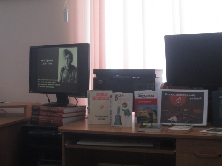 рамках Месячника памяти «Мы этой памяти верны». В центральной районной библиотеке для студентов профессионального колледжа состоялся литературно-поэтический час «Поэзия в бою». Присутствующим было представлено военное творчество таких поэтов как О. Берргольц, Ю. Друнина, Б. Окуджава, Э. Асадов, П. Коган, Б. Богатков и других.