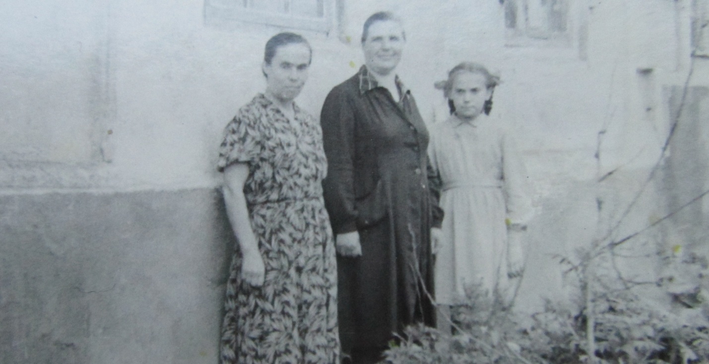 Заведующая библиотекой А.И. Садохина (в центре) и библиотекарь М.Селиханова (слева) перед зданием библиотеки ( ул.Чехова, 55 – бывшее здание магазина купца Афонина,