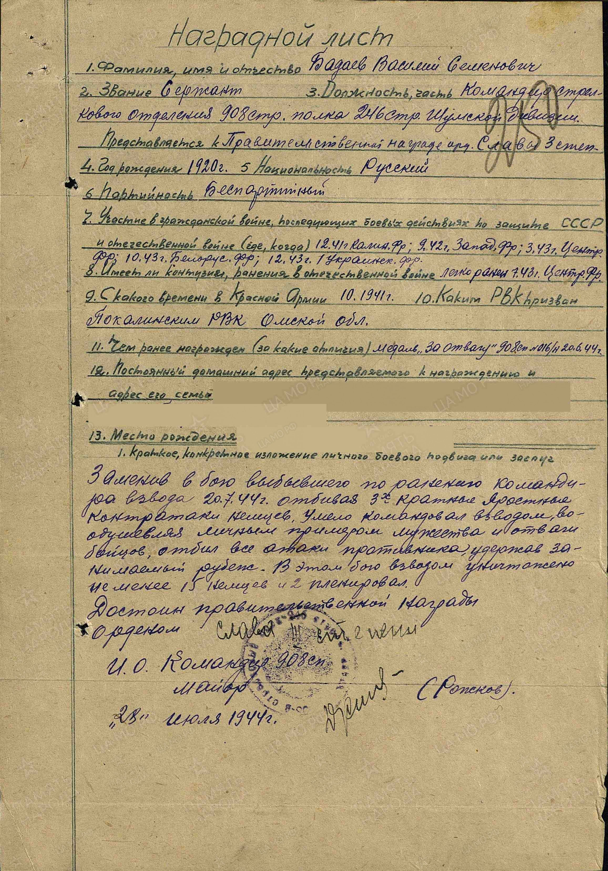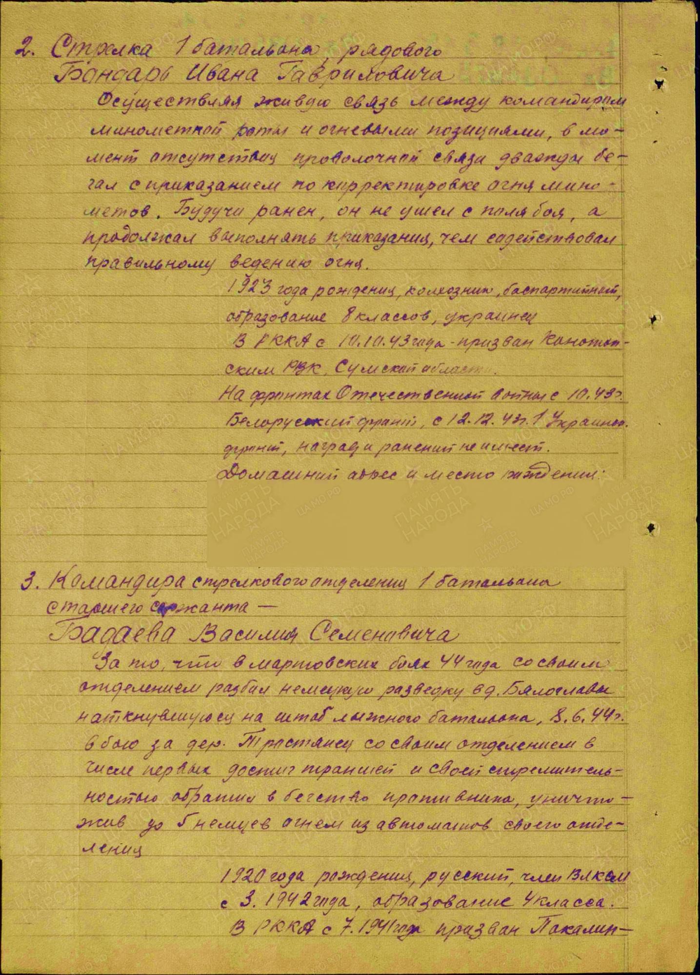 Через месяц 20 07. 44 года сержант Бадаев совершил подвиг, который был отмечен правительственной наградой Орденом Славы ӀӀӀ степени.